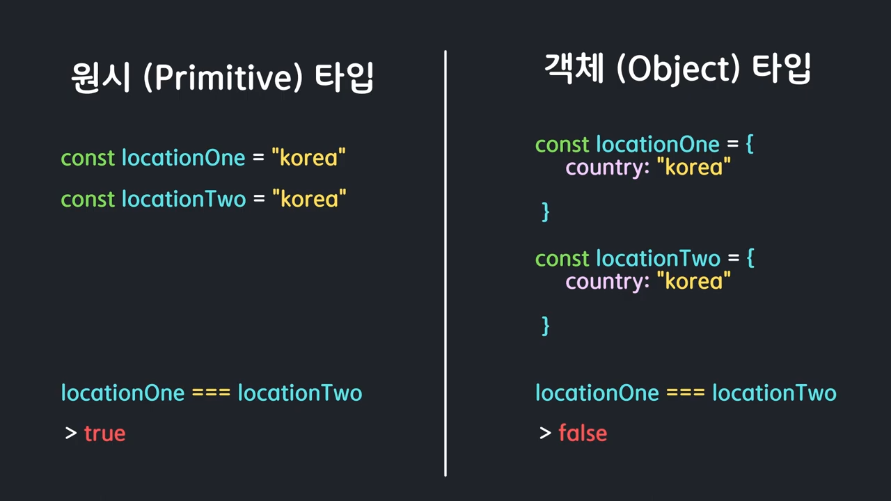 즉 객체데이터(참조형데이터)는 참조형데이터가 저장된 주소를 비교하게 되는데, 다른 주소를 비교하는 것이기 때문에 당연히 false가 나온다!