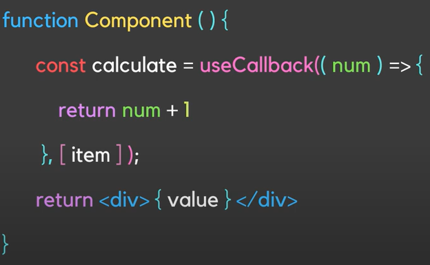 만약 calculate를 이렇게 할당한다면 렌더링이 될 때마다 계속 초기화하고 새로운 함수를 할당하게 된다. 하지만 useCallback hook으로 다음과 같이 감싸주면, 컴포넌트가 다시 렌더링 되더라도 memoize 된 함수를 재사용할 수 있다.