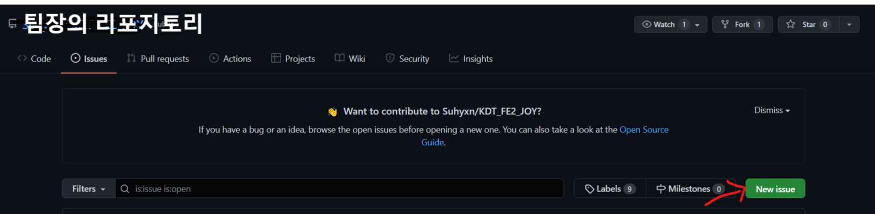 7. 팀원1과 팀원2는 먼저 팀장의 리포지토리에서 새로운 Issues를 생성한다.