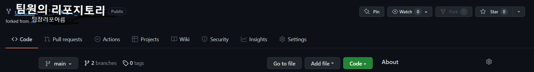 이후 팀원들에게 리포지토리를 fork 하라고 한다.