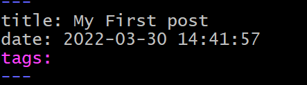 $ hexo new post "My First post"$ hexo new post "My First post" 를 입력하면 md파일이 하나 생성되고 주소가 표시가 된다.
