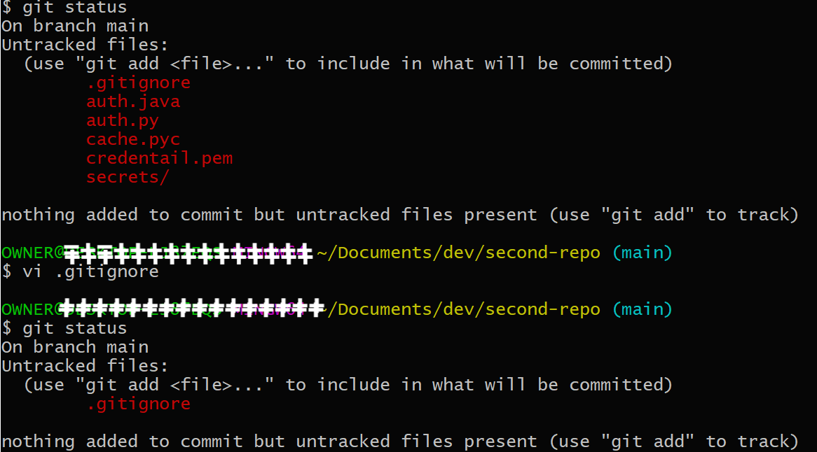 $ git status.gitignore에 들어가는 내용은 직접 추가해 주어도 되지만 밑의 링크를 참고하면 좋다.